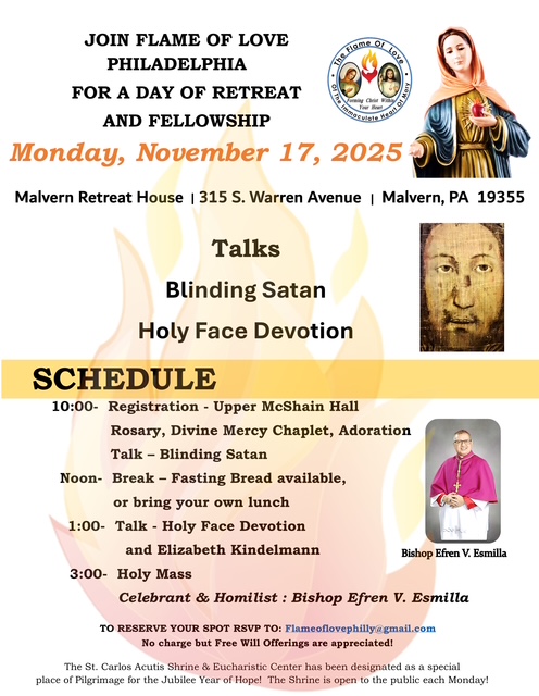 All are invited to attend this special Flame of Love Rosary at St. Teresa of Calcutta Church in Chester County on Tuesday, October 14, 2025. The schedule is 6:00 pm: Rosary, Adoration and Confession, and 7:00 pm: Procession and Holy Mass. The celebrant and homilist will be Bishop Efren V. Esmilia. Eucharistic Procession and Benediction will follow.