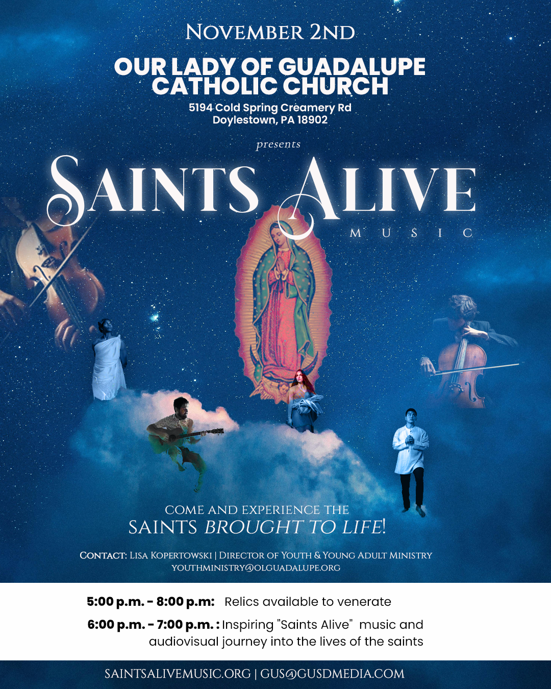 A beautiful evening with the saints.  Enter into their hearts with the musical and audio accompaniment of Gus DeSimone.  There will be a vast array of saints relics on display that evening to venerate.  This is an amazing opportunity to see so many relics and get a glimpse into their lives.  Mark your calendars. Schedule: 5-8pm Relics available to venerate, 6-7pm Inspiring Saints Alive! musical and audiovisual journey into the lives of the saints