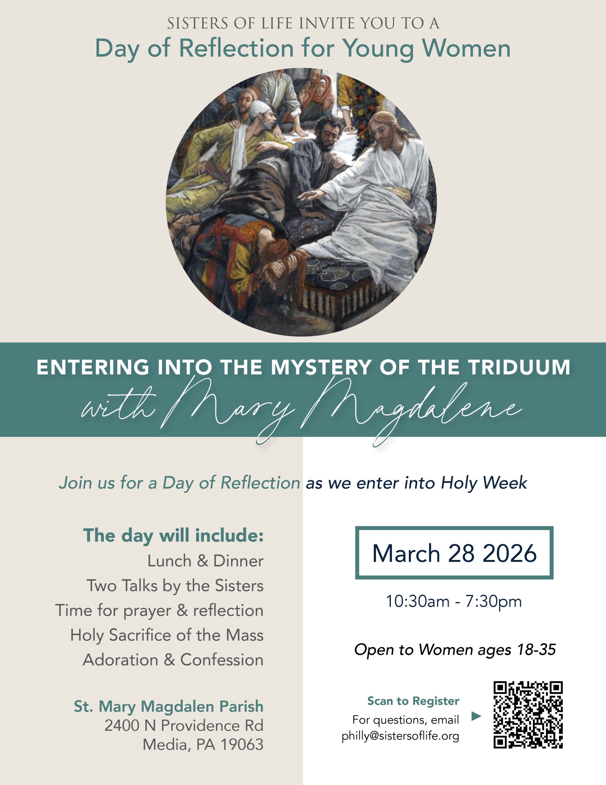 Event: Join the Sisters of Life for a Day of Reflection for young women ages 18-35 This will be a beautiful way to step away from the demands of life for a few hours and enter into the graces of the Triduum. The theme will be Entering into the Mystery of the Triduum with Mary Magdalene and will include two talks given by the Sisters, times for prayer and silence, the Mass, adoration and confession. Lunch and dinner will be provided.